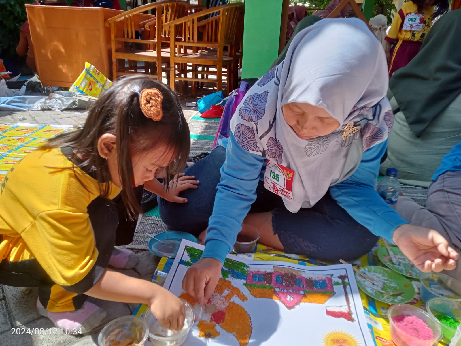 Lomba yang diadakan pada hari ini di Pendopo Kecamatan Patianrowo berbeda dari lomba mewarnai pada umumnya, kali ini panitia mengajak peserta untuk menggunakan parutan kelapa yang telah diberi pewarna alami sebagai media untuk mewarnai. Inovasi ini bertujuan untuk mengedukasi anak-anak tentang bahan alami serta melatih keterampilan motorik halus mereka. Para peserta dari Desa Lestari, yang merupakan kelompok anak TK Pertiwi, menunjukkan semangat dan kreativitas yang tinggi. Mereka memanfaatkan parutan kelapa berwarna-warni untuk menciptakan berbagai gambar yang menarik dan penuh warna.