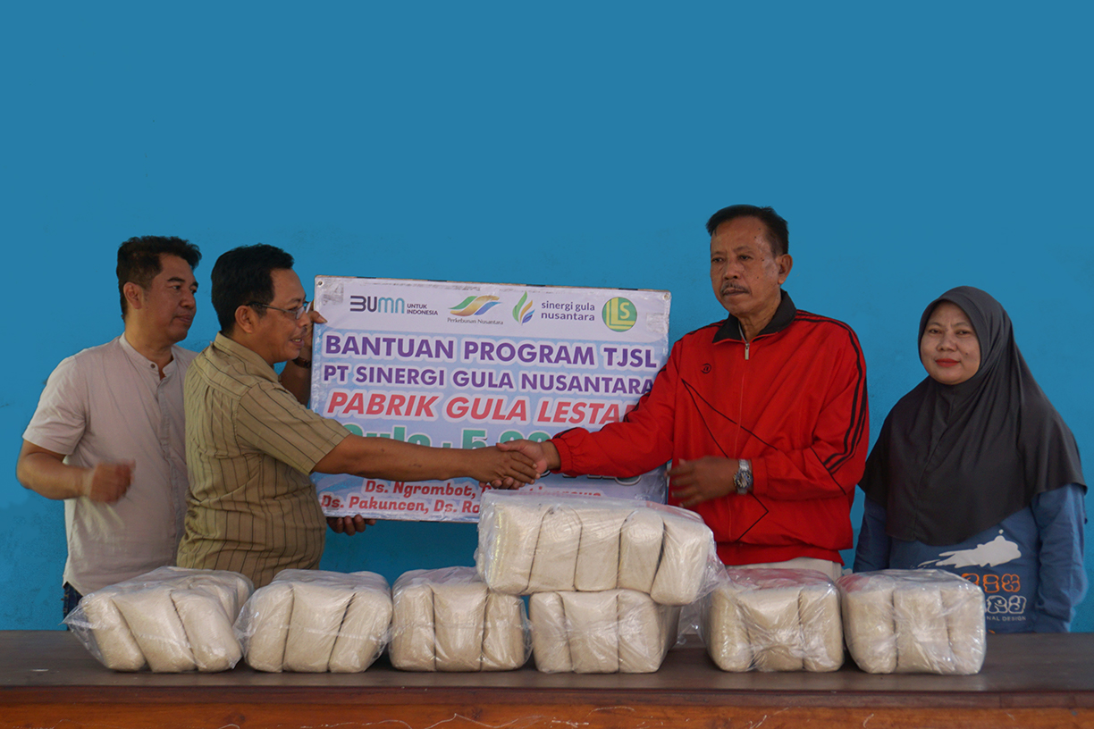 Penyaluran Bantuan Program TJSL (Tanggung Jawab Sosial Lingkungan) oleh PT Sinergi Gula Nusantara Pabrik Gula Lestari kepada masyarakat Desa Lestari.